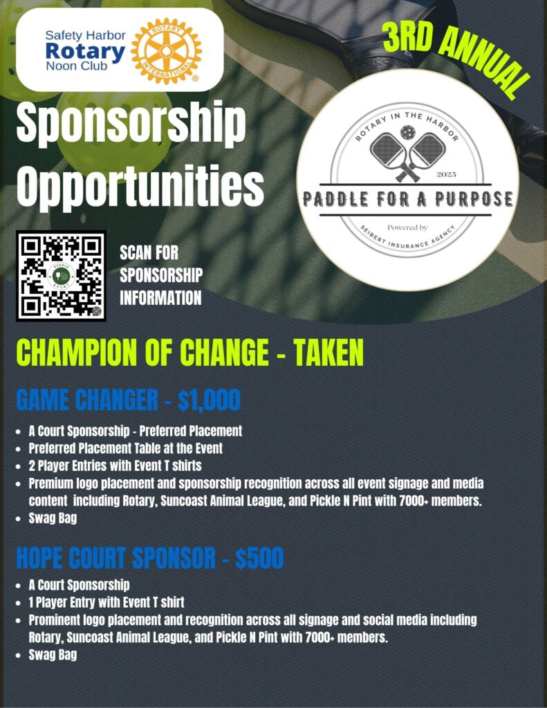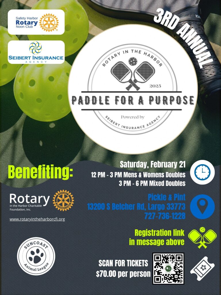 Saturday, February 21, 2026 | Pickle & Pint – Largo, FL Get ready to serve up some fun for a great cause! Join the Rotary Club of Safety Harbor Noon for our 3rd Annual Paddle for a Purpose Pickleball Tournament, hosted at the popular Pickle & Pint in Largo, Florida. This exciting day of friendly competition brings together players of…