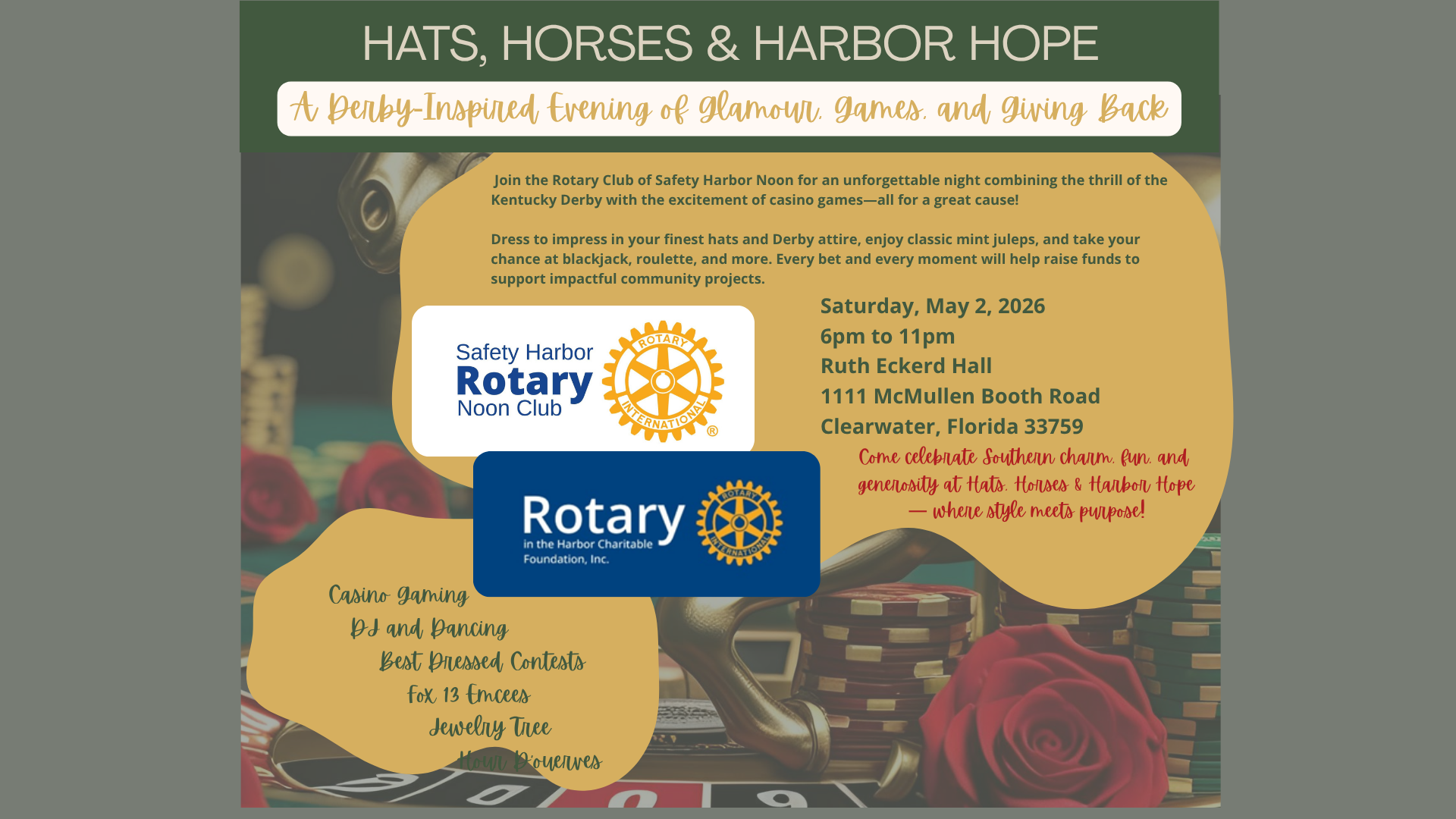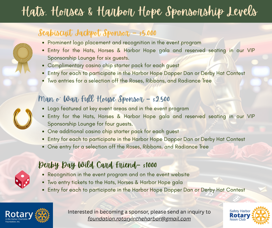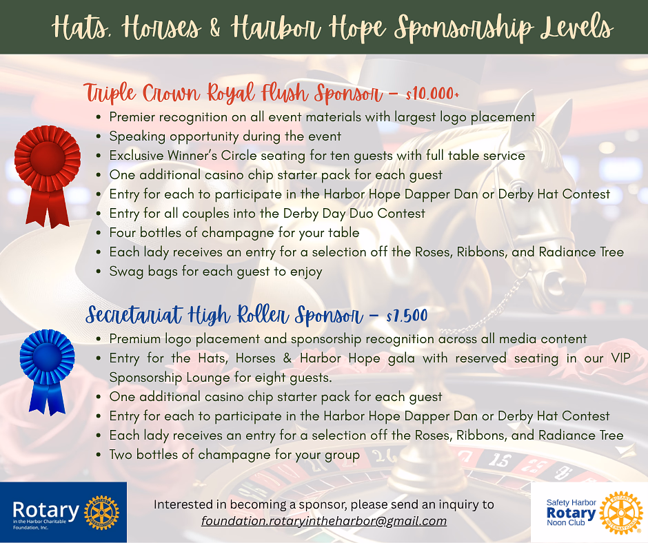 Join the Rotary Club of Safety Harbor Noon for an unforgettable night combining the thrill of the Kentucky Derby with the excitement of casino games—all for a great cause! Dress to impress in your finest hats and Derby attire, enjoy classic mint juleps, and take your chance at blackjack, roulette, and more. Every bet and every moment will help raise…